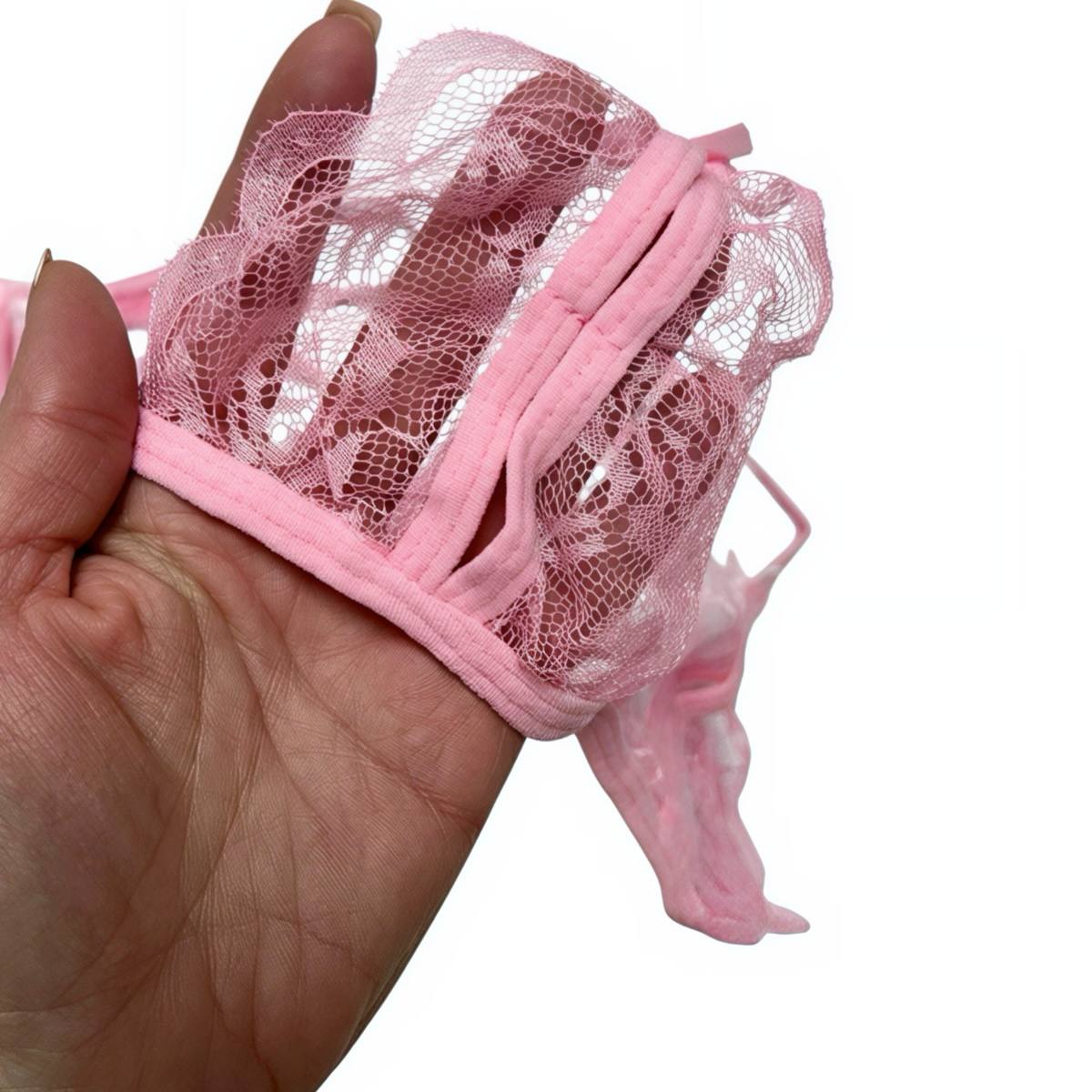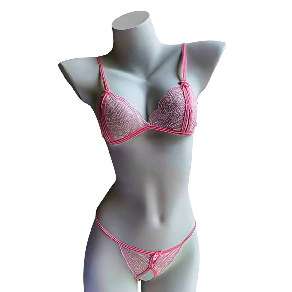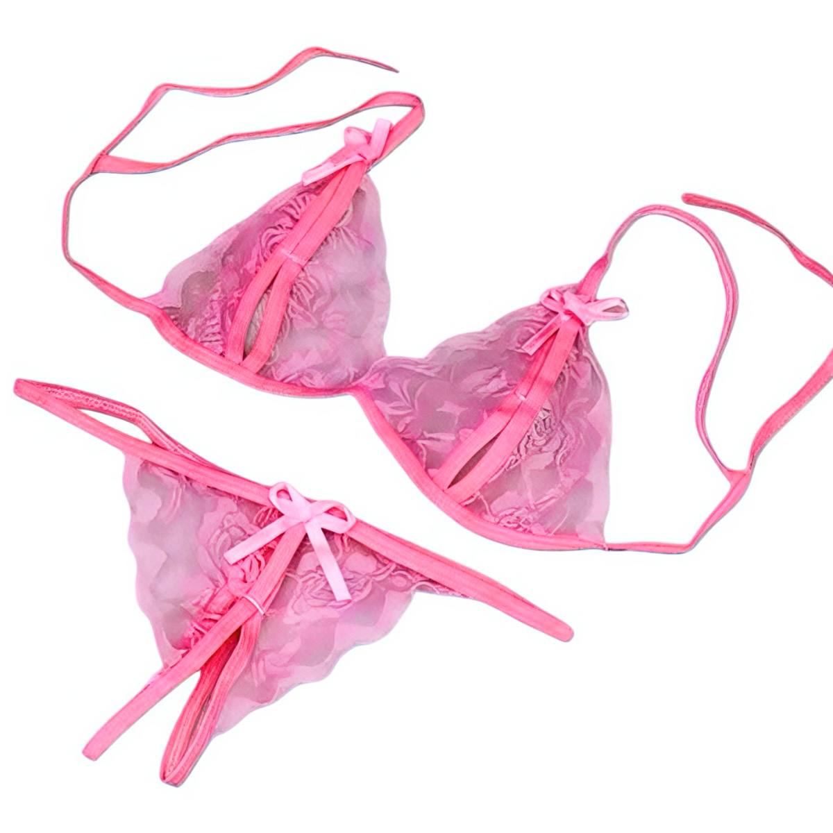 Рожевий комплект еротичної білизни у прозорому форматі з мереживною текстурою. Складається з ліфа з тонкими бретелями та трусиків без пояса. Модель має легкий відкритий крій і декоративні бантики. Формат підкреслює силует і створює делікатний візуальний акцент.