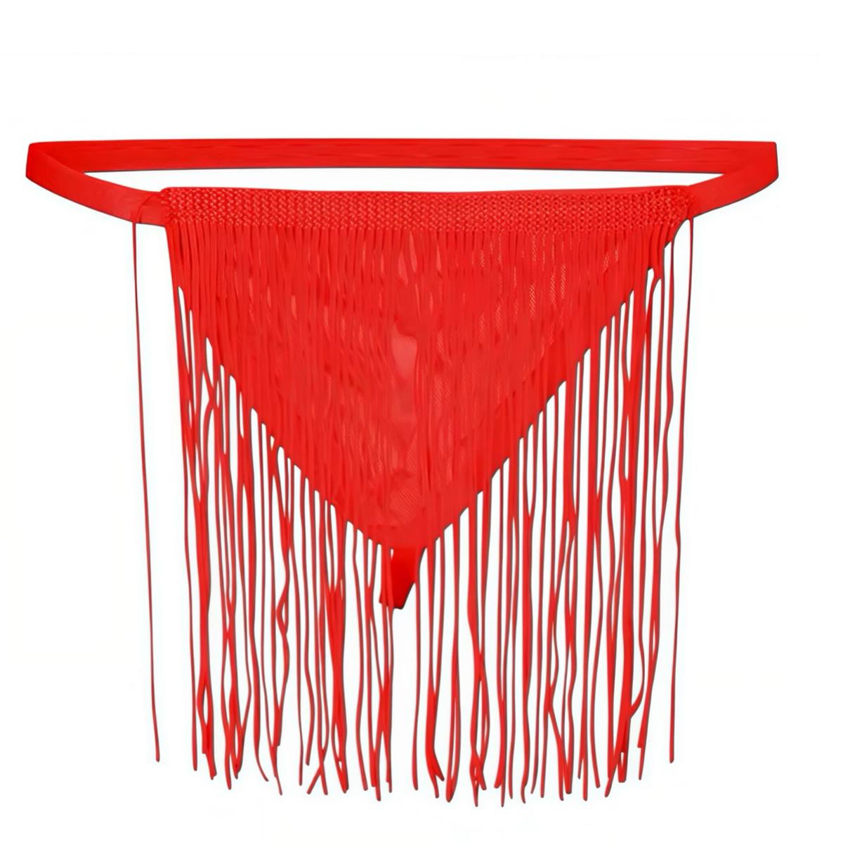 Це чоловічі стрінги з декоративною бахромою у передній частині. Модель виконана у насиченому червоному кольорі та має відкритий мінімалістичний формат. Довгі нитки створюють динамічний візуальний ефект і формують акцент в образі.