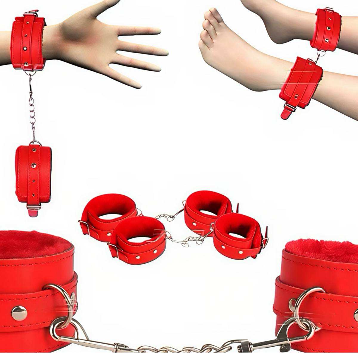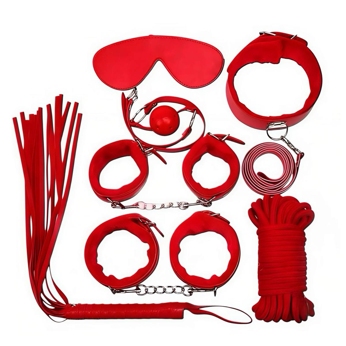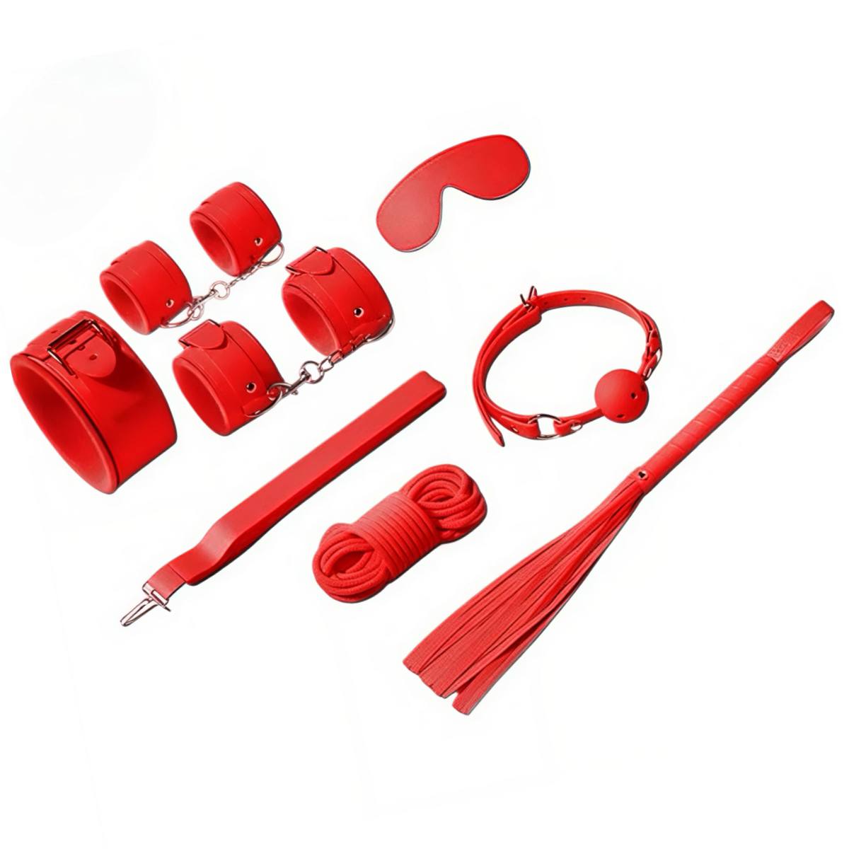 Комплект для БДСМ-практик, що включає 7 предметів для рольових ігор. Модель виконана у червоному кольорі та призначена для використання в домашніх умовах. Формат підходить для сценаріїв з фіксацією та тематичної атрибутики.