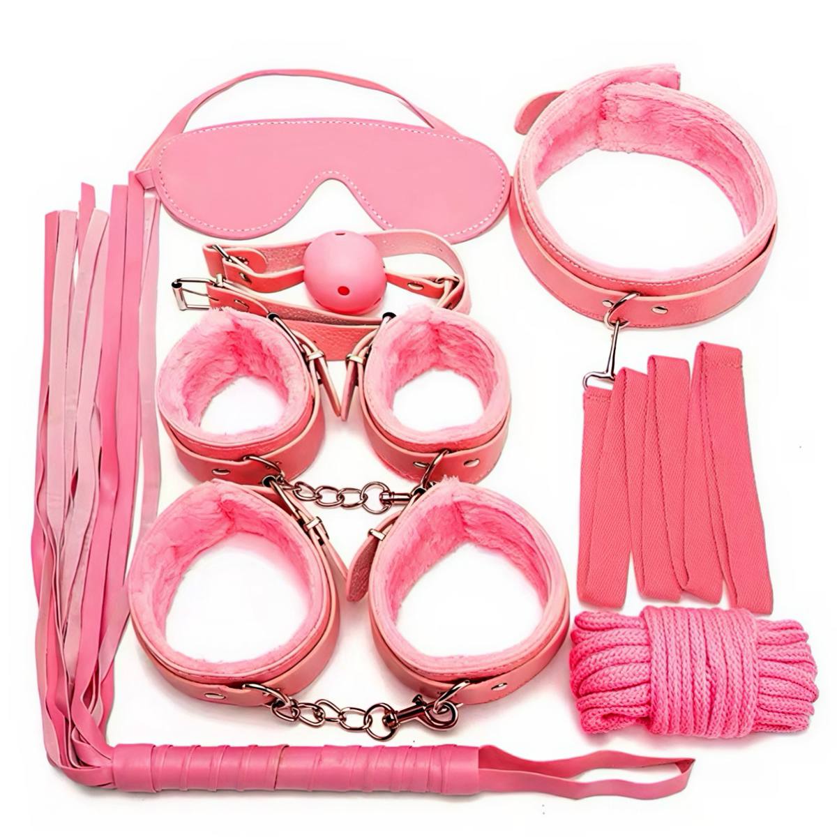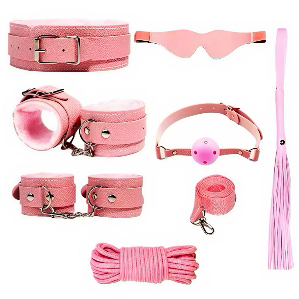 Комплект із семи предметів для БДСМ-ігор у рожевому кольорі. Набір поєднує аксесуари для обмеження рухів і сенсорної ізоляції. Підходить для використання в домашніх умовах і рольових сценаріях. Формат дозволяє комбінувати елементи між собою.